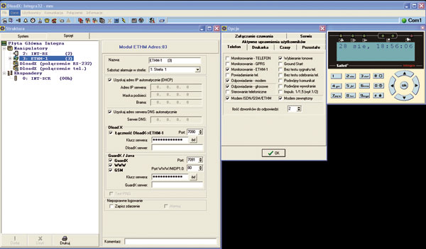 Dzięki otwartemu protokołowi wymiany danych możliwe jest napisanie oprogramowania realizującego niemalże każdą funkcję. Przykład wykorzystania modułu do rozbudowy systemu pokazany jest na rys. 8. Do portu RS232 modułu został podłączony komputer przemysłowy z oprogramowaniem, którego głównym zadaniem jest interpretacja informacji przychodzących z modułu, a także zwrotne wysyłanie odpowiednio przygotowanych komunikatów. Drugim medium konfiguracyjnym komputera jest port sieci Ethernet, z którego otrzymuje on informacje przekazywane systemowi alarmowemu. Zainstalowane oprogramowanie może: